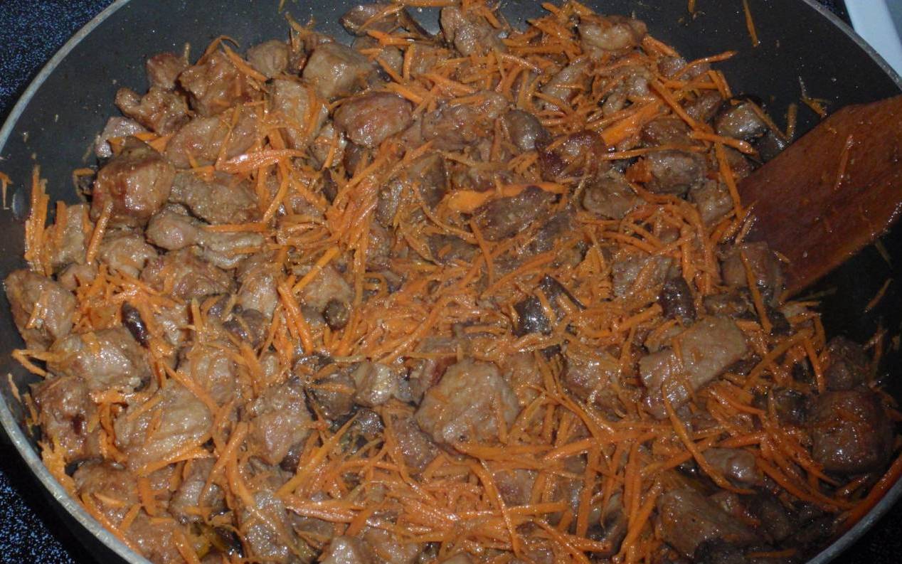 Промойте сердечки и обжарьте их на сковороде в (72 %) сливочном масле. В момент полуготовности отправьте к ним нашинкованные лук и морковь. Через 15 минут они будут готовы. Теперь налейте в казанок воду, выложите к ней промытую гречку, поверх выложите обжаренные сердечки и любимые приправы. Вариться под крышкой блюдо будет 40 минут на медленном огне. По завершению приготовления под крышку казана положите еще один кусочек сливочного масла, так блюдо будет молочнее, более нежным.