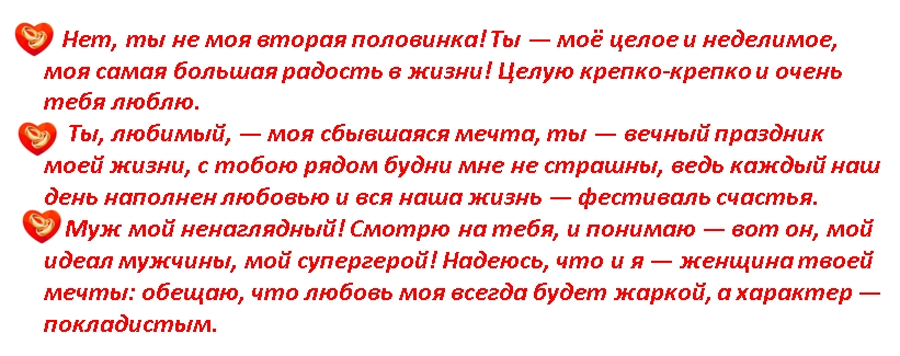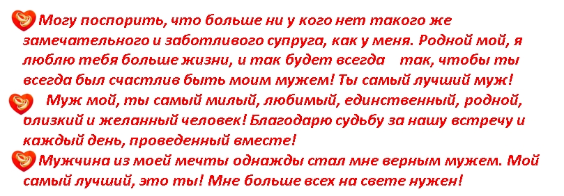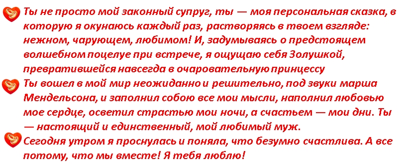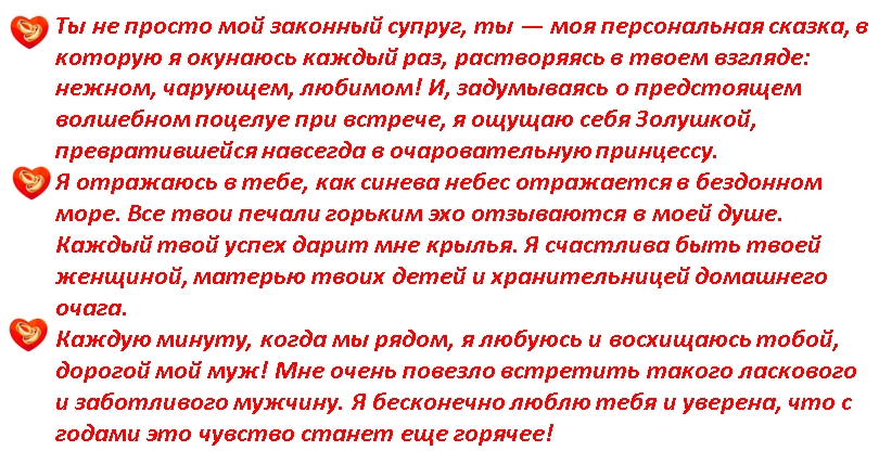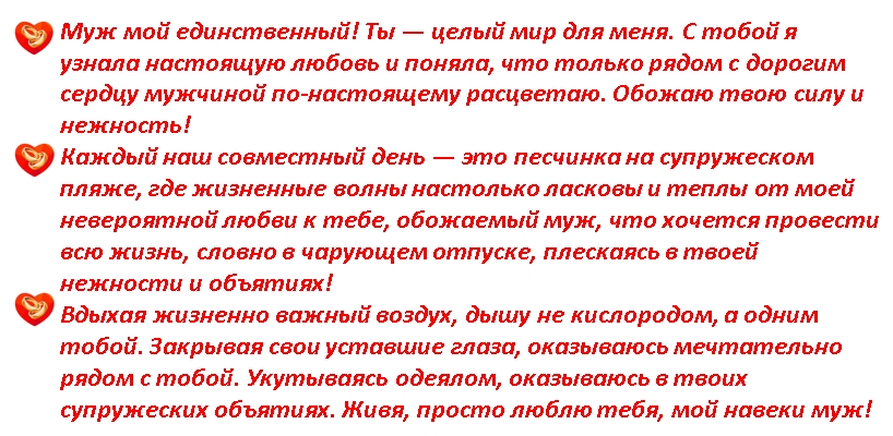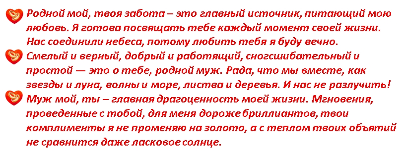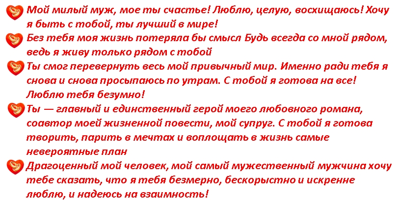 Выразить свою любовь к своему мужу можно разными способами. Мы предлагаем не пренебрегать красивыми и теплыми словами, от которых растает сердце у любого мужчины.