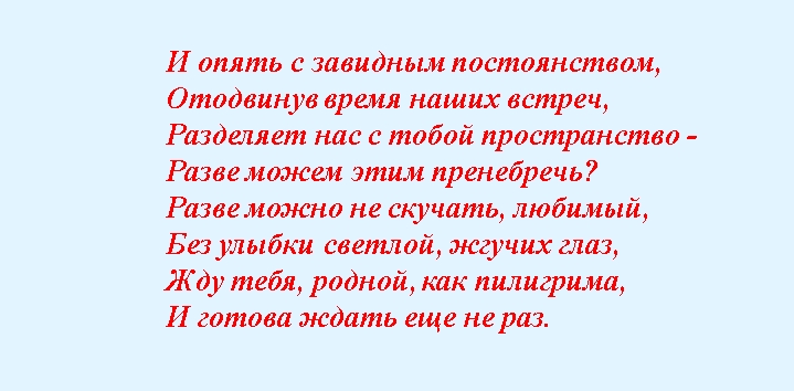 - Я хочу, чтобы ты знал, нет такой силы, которая заставит меня разлюбить тебя. Даже на расстоянии я чувствую тебя, твой запах, твоя улыбка, твой взгляд всегда со мной рядом.