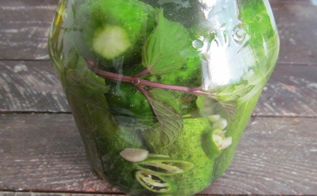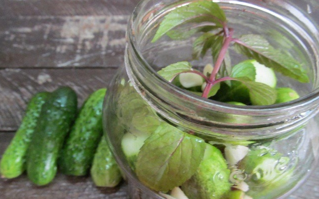 Банку помойте и простерилизуйте. Сложите огурцы плотно, чеснок порежьте пластинками. Мяту положите сверху. Порежьте острый перец (кто любит), добавьте к огурцам.