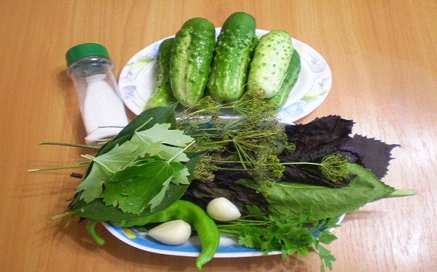 На пару часов следует залить огурчики водой (холодной). Промойте тщательно зелень, чеснок почистите. Любителям острого можно добавить перчинку.