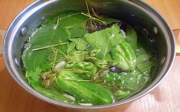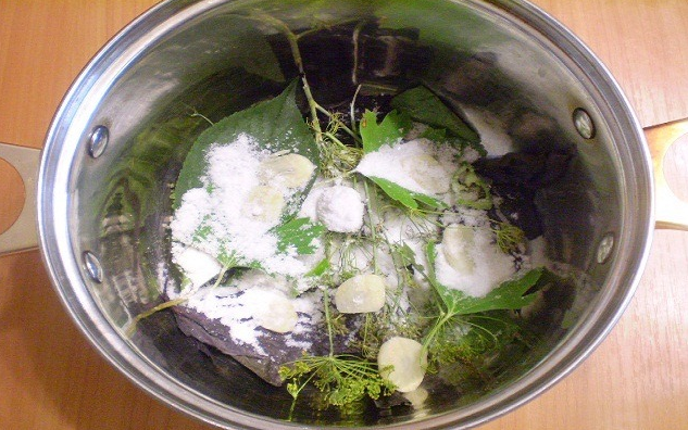 - листочки вишни, хрена, смородины (черной) — по вкусу; листочки можно использовать сухие