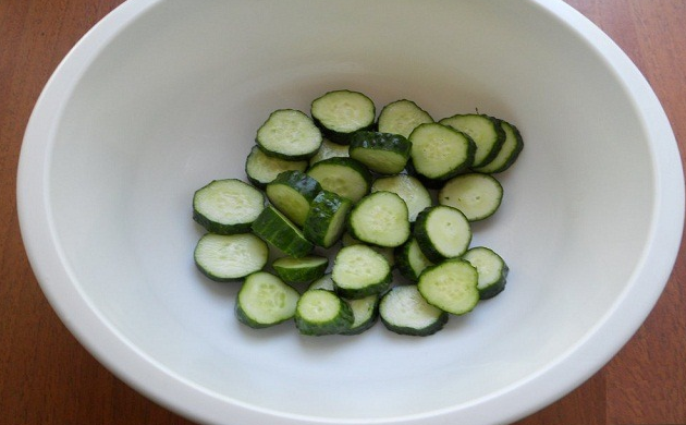 Огурчики помойте хорошо и порежьте их на кружочки, положите в глубокую посуду.
