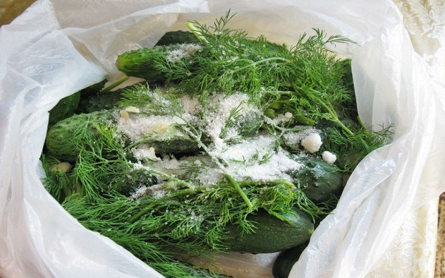 Приготовьте плотный полиэтиленовый пакет и уложите туда огурцы. Уложите сверху укроп, засыпьте сахаром и солью. Положите измельченный чеснок. Пакет завяжите, встряхните несколько раз. Содержимое должно хорошо перемешаться.