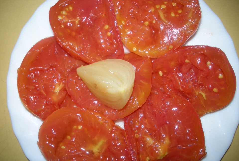 Сочетание лука и помидоров считается одним из лучших в кулинарии. Сладковатый привкус помидоров и острая нотка лука придется по вкусу даже тем, кто не любит травянистое растение. В консервации лук приглушается уксусом и пропитывается соками соседних ингредиентов.