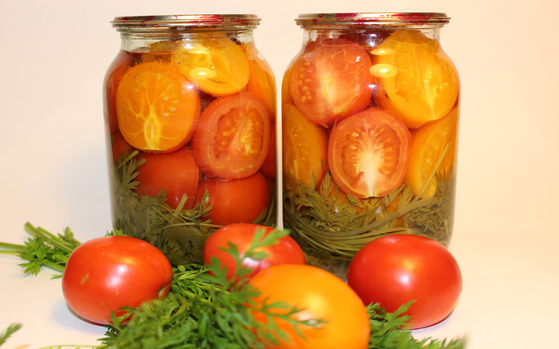 Зелень не только отлично сочетается с красными и желтыми помидорами, но и добавляет прекрасные вкусовые нотки. Выбирайте те травы, которые вам нравятся больше всего: кинзу, сухой или свежий укроп, вяленую или только что собранную петрушку, да хоть сам базилик. Экспериментируйте с вкусами, наполните свои баночки разными травами и проверьте, какой агент был вкуснее всего.