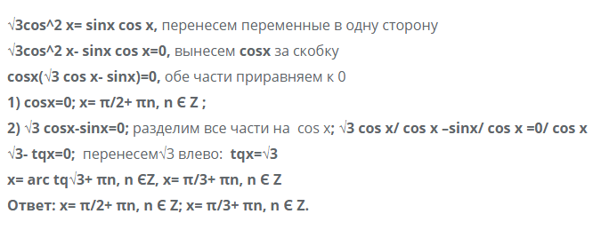 Если cos x=0, тогда х=π/2+ nπ. Косинус равен нулю для дуг, которые заканчиваются на концах вертикального диаметра. Множество таких дуг выражают формулой х= π/2+ nπ.