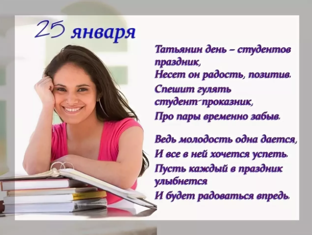 День 25 января, называют Татьяниным днем и связан он с открытием первого в России университета. Именно в этот день российская Императрица Елизавета подписала указ о его открытии. Но, праздновать этот день студенты стали не сразу, а только после указа Николая I, Российского императора. Еще этот день известен тем, что является днем памяти великомученицы Татьяны, которая жила в третьем веке и придерживалась христианской веры, за что была приговорена к смертной казни. Следует сказать, что в те времена процветало язычество. На территории МГУ находится освещенный храм в ее честь. С тех пор, 25 января, празднуют два праздника. Считается, что святая Татьяна является покровительницей студентов и преподавателей.