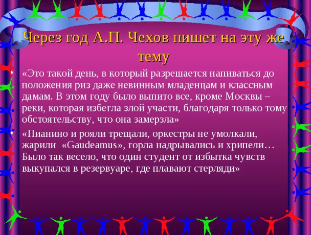 А вот что писали А.П. Чехов о дне студента в 80-х годах 19 века, в те времена он учился в Университете на медицинском факультете.