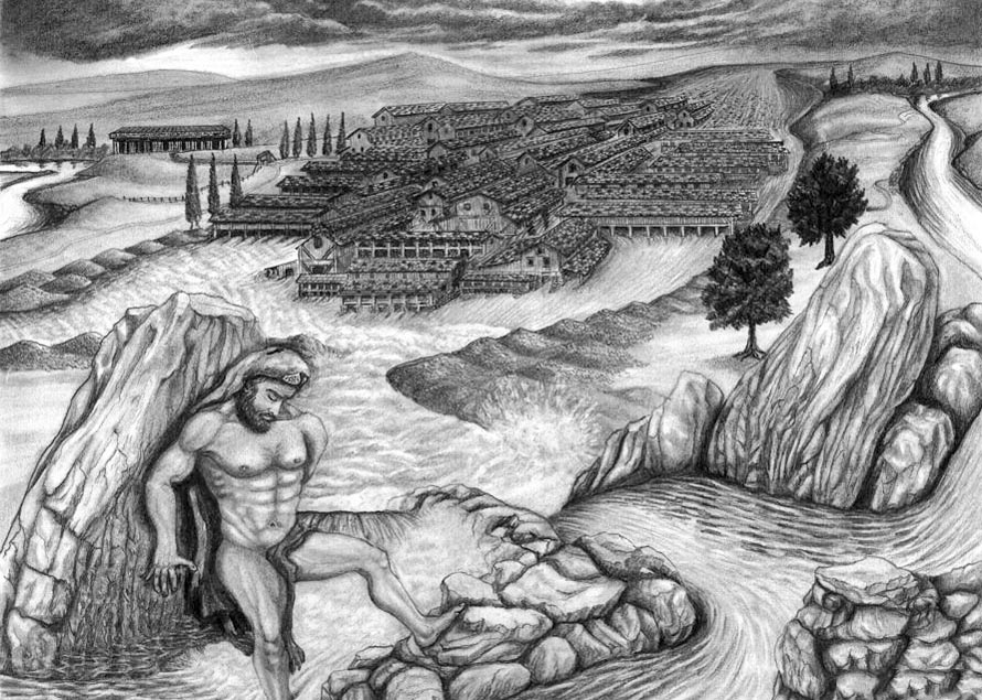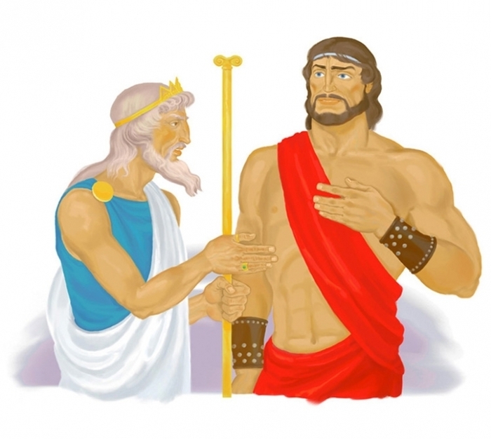 Воцарились Боги на Олимпе во главе с Зевсом, который повелевал судьбами людей. Высоко над ними голубое солнечное небо, нет ни дождя ни снега и царит вечное лето. Внизу — облака, иногда закрывающие землю, где у людей сменяются времена года, бывает радость и горе. У ворот его дворца стоят два сосуда с разным содержимом, в одном — дары для тех, кто совершает добро, в другом — для злых людей. Не избежать неприятностей тем, кто нарушает земные законы.
