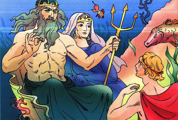 На морском дне стоит дворец Посейдона, властителя морей. На малейшее движение его руки, в которой он держит трезубец отзываются волны. Вместе с Посейдоном живет Амфитрита, дочь Нерея (морской вещий старец). Однажды, на берегу, увидел морской властитель, как прекрасные нереиды водят хоровод, среди них и была Амфитрита, которая приглянулась Посейдону и решил он ее похитить. Но, не удалось ему это сделать с первого раза, так как, Амфитрита спряталась от него у Атласа, титана, который держал небо. Подсказал Посейдону, где находится полюбившаяся ему нереида, дельфин, но попросил за это причислить его к небесным созвездиям. Так и произошло похищение и дальнейшая женитьба Посейдона и Амфитриты.