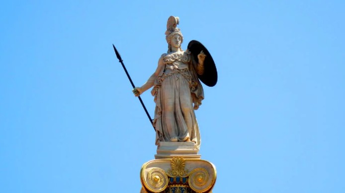 Родилась она из головы своего отца, Зевса, в тот момент, когда у того разболелась голова и он попросил Гефеста (один из сыновей Зевса), вскрыть череп, чтобы узнать почему его мучает головная боль. В этот момент и появилась из головы Зевса на свет Афина в доспехах, которая  являлась покровительницей военного дела и мудрости. У нее есть и другие статусы — покровительство военному делу, но не агрессивной войне, а стратегической, а, так же, ремеслам и искусствам. Согласно легенде, Афина многое дала людям, благодаря ей, зародилось земледелие, животных стали использовать в сельском хозяйстве. Кроме этого, приручение лошадей, тоже заслуга этой Богини.