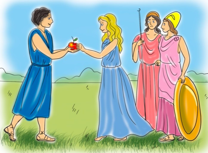 На свадьбе родителей Ахиллеса, были гости, среди которых присутствовали богини — Афина (Богиня мудрости), Гера (супруга Зевса), Афродита (Богиня Любви). Но, не была приглашена богиня, которая вызывала раздор — Эрида, чтобы не испортить торжество. На что та обиделась и решила подбросить яблоко, на котором написано, что оно адресовано самой прекрасной. Увидев его на столе, богини стали спорить, кому предназначено яблоко и никак не могли договорится. Тогда их решил рассудить Парис (сын царя Трои) и отдал яблоко Афродите. За это она отблагодарила Париса и помогла похитить прекрасную Елену (дочь Леды и Зевса, жену Менелая). После этого началась Троянская война.