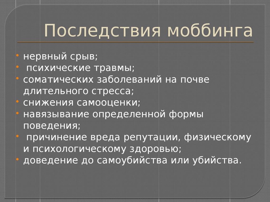 Последствия моббинга, могут быть плачевными для всех его участников. Начиная с того, что не здоровая атмосфера в коллективе, отрицательно сказывается на результатах труда. Если жертва преследования, не научится выживать и не будет хранить спокойствие, это может плохо кончиться для него. Подрыв здоровья, стрессы, нервные срывы — прямое следствие моббинга. Сотрудник, дабы как можно меньше находиться на работе, все чаще берет больничный. Те, кто психически, менее сильный, предпочитает уволиться. Но, приходя, на новое место работы, воспоминания о травле, на столько сильны, что человек, начинает чувствовать себя неуверенно, боясь опять попасть под «раздачу». Не редки случаи, когда, данные действия, наводят на мысли о смерти. Известны попытки самоубийства, жертв моббинга. Кроме этого, страдают личные и семейные отношения. Можно сделать вывод, что такое нездоровое поведение людей, не приводит ни к чему хорошему.