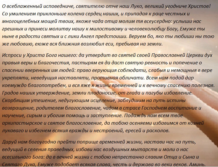 Прошение к святому угоднику Луке Крымскому. Его рекомендовано читать на протяжении сорока дней, в утренние часы. Чтение молитвы начинается намного раньше оговоренной даты операции.
