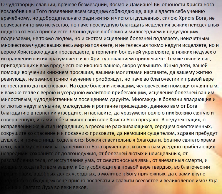 Косма и Демиан-римские благотворители, покровители детей. На Руси испокон веков Косма и Демиан почитаемые за исцеление от недугов, врачебную помощь. Они одни из самых сильных покровителей для учащихся.