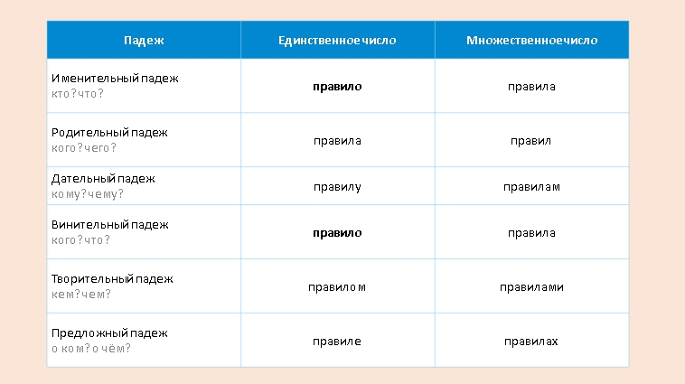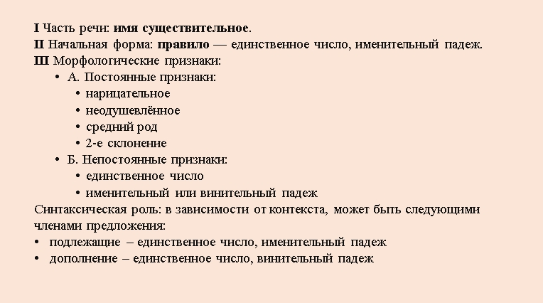 Непостоянный признак меняется в зависимости от формы слова в предложении, т.е., нужно задать вопрос и установить падеж. Во множественном числе и падеже именительном слово произносится так — правила (они), в этом случае при морфологическом разборе еще один признак, относящийся к непостоянным — число. Очевидно, что в таком звучании оно будет множественным.
