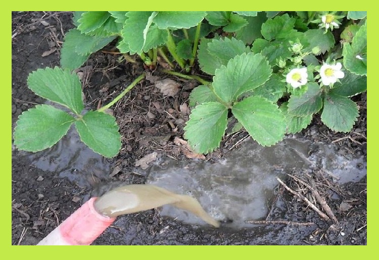 - По истечении отведенного времени, разводят 0,5 л концентрата в 7 л теплой воды. Полученным коктейлем подливают кусты клубники.