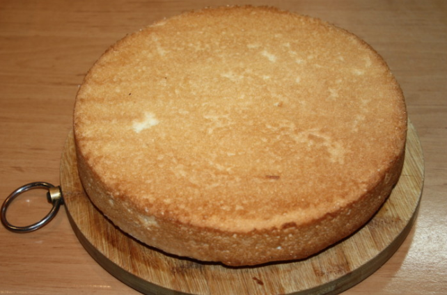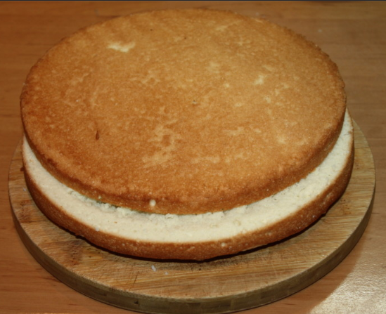 - Застелить пергаментом подготовленную тарелку для торта и положить корж.