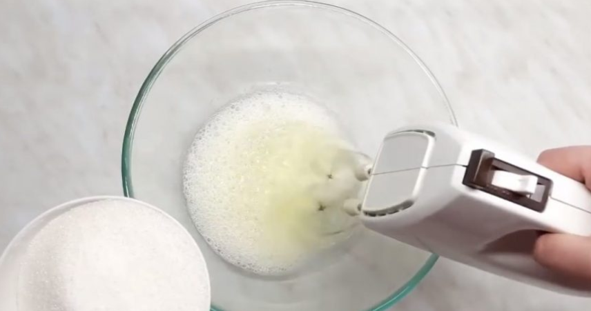 Отделить белки от желтков и взбить на малой скорости, 10 минут, добавляя сахар. Мусс увеличится в объеме и побелеет.