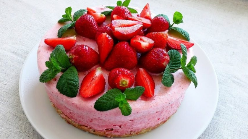 Добавить пюре из клубники и взбивать несколько мин. Если получилось слишком сладко, можно добавить сок лимона. Вылить мусс в основу из печенья, потрясти форму и поставить на ночь в морозилку.