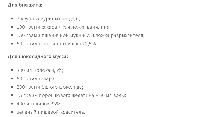 В основе торта — бисквит кофейно — шоколадный, с которого начинают приготовление. Затем приступают к изготовлению шоколадного мусса в несколько приемов.