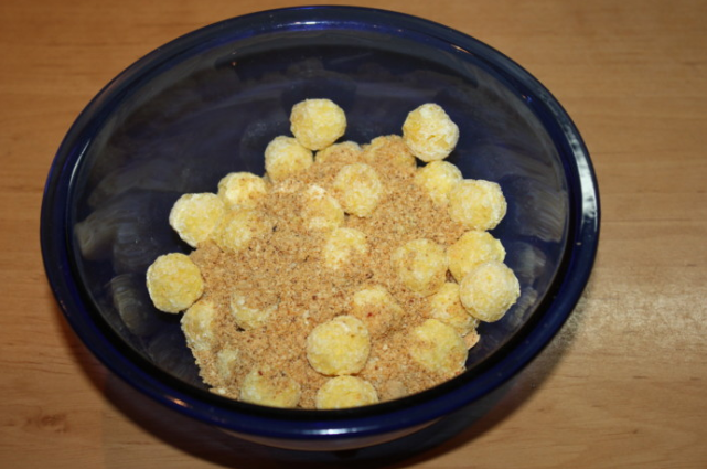 Положить в миску вафельные шарики и добавить к ним молотые орехи.