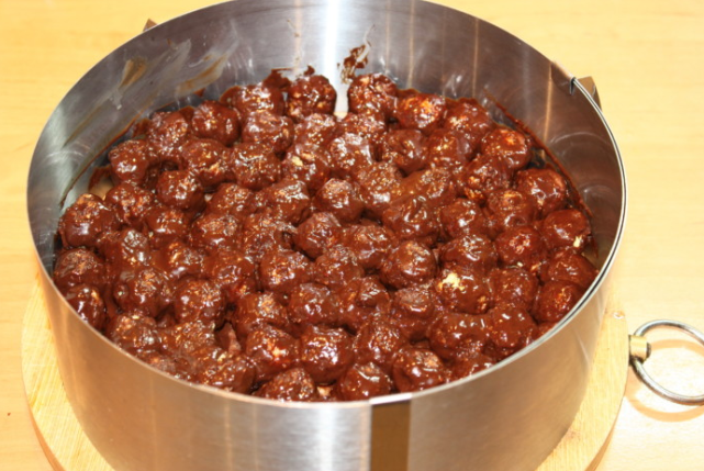 На бисквит одеваем кондитерскую форму (кольцо). Если бисквит сухой, пропитываем сиропом. Шоколад подробить, залить горячим молоком, подождать пока расплавится. Можно поставить в микроволновую печь. Молоко и шоколад должны приобрести расплавленную однородную текстуру. Залить вафельные шарики шоколадом, перемешать и выложить массу на один бисквит ровным слоем и оставить застывать.