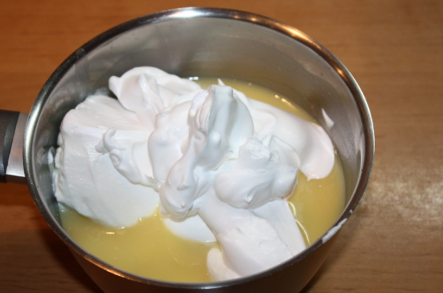 - Сливки смешать с сухим обезжиренным молоком и нагреть.