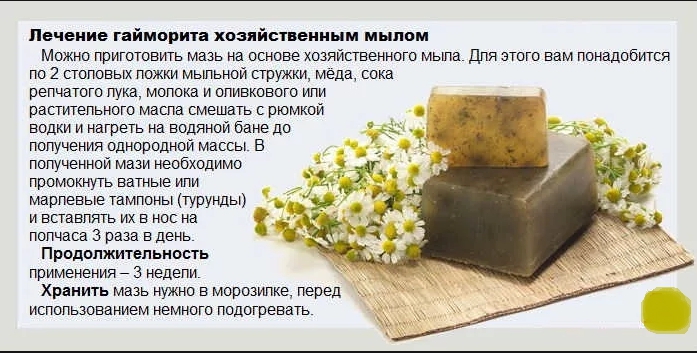 Против насморка эффективно санирование носовых проходом мыльным раствором. На двести грамм чистой теплой воды нужно взять чайную ложку «хозяйственной» стружки. Готовым раствором делать промывку носа с помощью спринцовки. В состав можно добавить несколько капель лукового сока. После процедуры не пугайтесь, если откроется сильное чихание. Так из организма будет выходить патогенная микрофлора. Альтернативой полосканиям могут стать обычные прикладывания мыльных сколов в каждую ноздрю. При отеке пазух возьмите два кусочка мыла и положите в нос. Этот рецепт сугубо для взрослых, так как агрессивное мыло может повредить детскую слизистую.