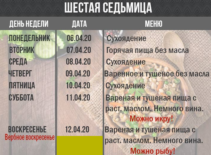 Есть можно только после вечерней службы. Церковный устав по выходным разрешает питаться дважды. Именно поэтому, дни субботы и воскресенья считаются не постными. Можно готовить больше блюд, пить красное вино, но количество его должно быть умеренным. Исключение первая и последняя недели поста.