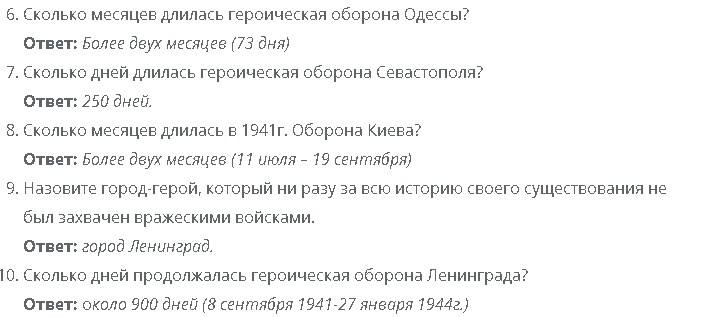 • Сколько дней смогли продержаться бойцы, защищавшие Брестскую крепость? Ответ: 30.