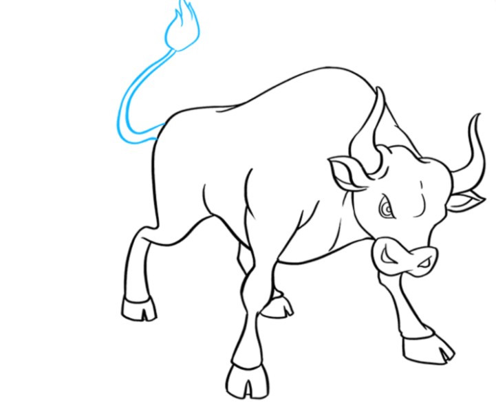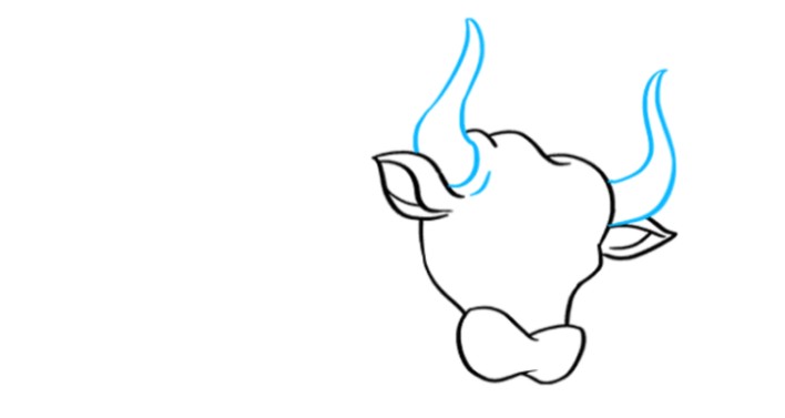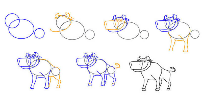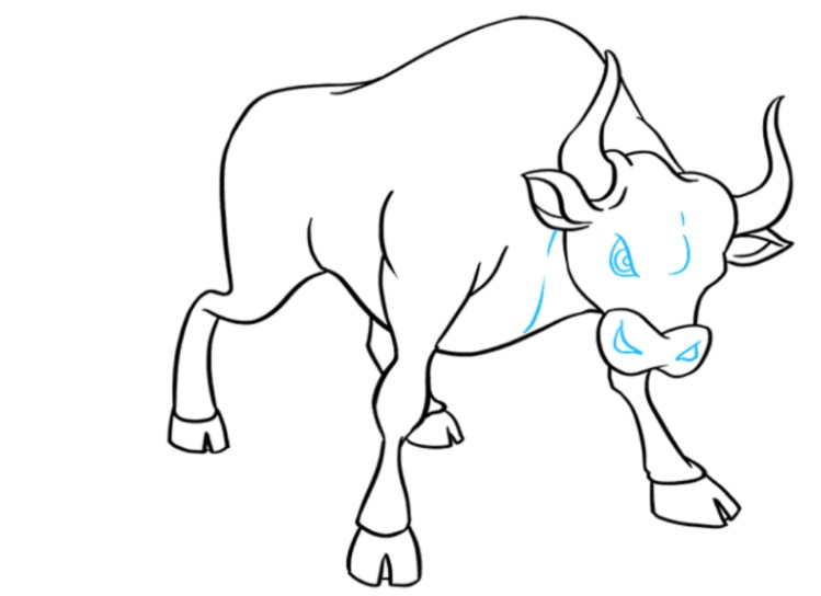 Еще одно изображение символа года, Быка, нарисовать совсем не сложно. Для вашего удобства каждый этап рисования обозначен голубыми линиями. Следуйте пошаговой инструкции, приготовьте ластик, чтобы стирать лишнее.