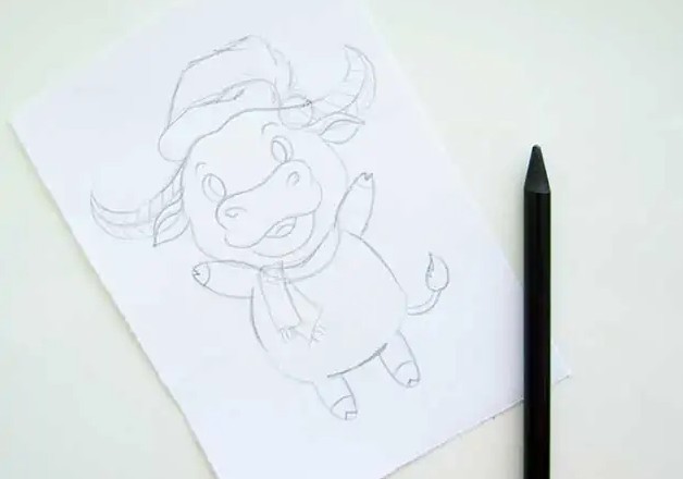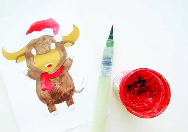 Следующий вариант — маленький бычок в новогодней шапочке Деда Мороза. Подготовьте все необходимое — карандаш, ластик, плотный лист бумаги, гуашь, кисточку, стакан с водой и приступайте.