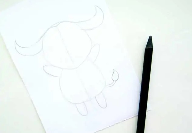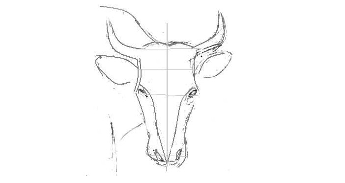 - Проведите вертикальную лини, наметьте карандашом туловище и голову, добавьте лапки, хвостик, рога, ноги.