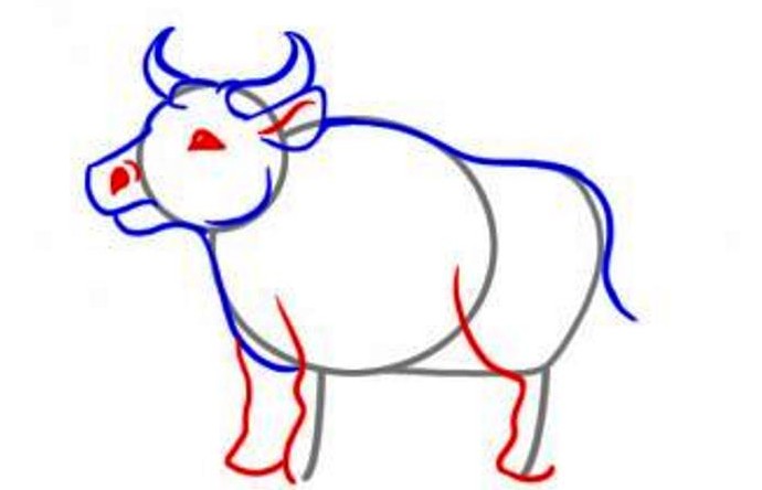 Приступая к рисованию Быка, обратите внимание на подсказки — красные линии. Каждый следующий шаг указан в красном цвете.