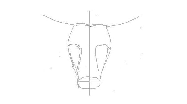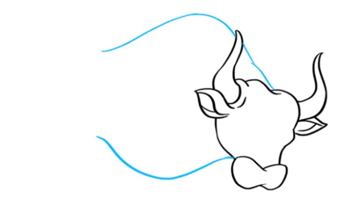 - Уши нарисуйте под рогами, затем, морду, большой нос, а в нем кольцо.