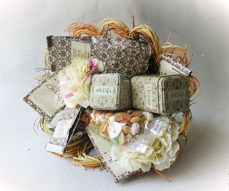 - Короб со сладостями. Коробкой эту композицию назвать довольно сложно, но вот подобранное содержимого хватит на несколько праздничных дней. Как раз то, что нужно для чаепития 1 сентября, на День учителя или другой подходящий праздник;