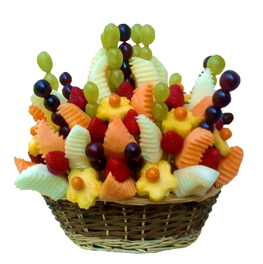 Дарится исключительно в целлофановой упаковке. Каждый вид фрукта нарезается фигурным ножом и надевается на пластиковые палочки-шпажки. Для наполнения корзины можно использовать абсолютно разные фрукты, исключение лишь яблоки и груши, т.к. они могут преждевременно поменять цвет;