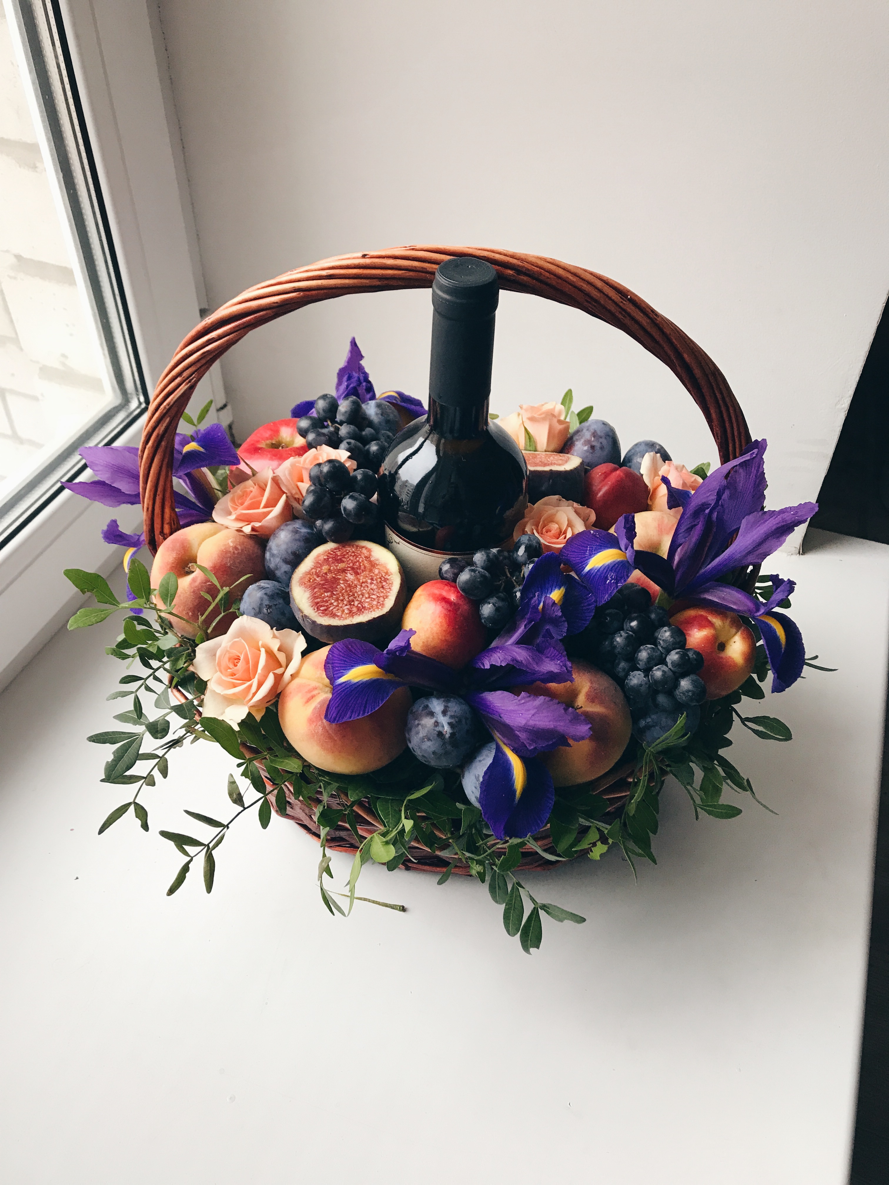 Корзина довольно прочная поклажа, которая вместит в себя красивую бутылку вина и подходящий фруктовый набор;