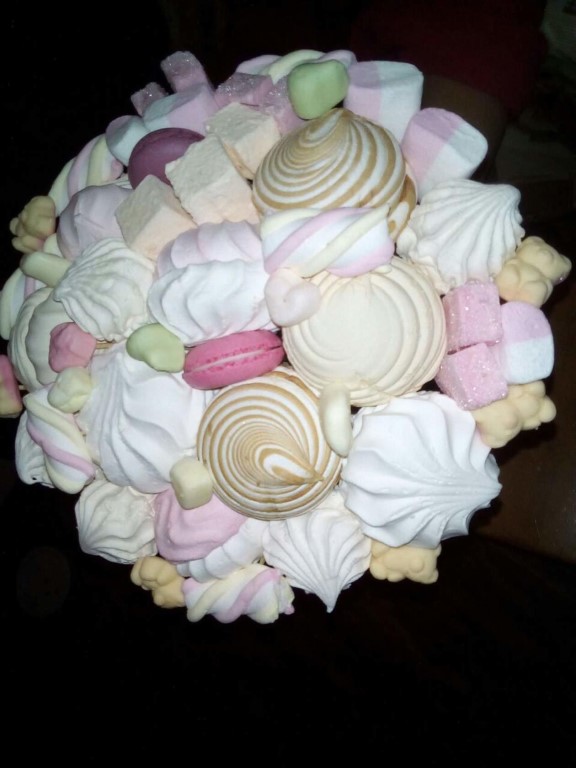 - Зефирные букеты лучше сочетать со съедобными ингредиентами родственного вкусового стиля: сладкий зефир и сладкое печенье, пастила и маршмеллоу, дольки апельсина и половинки яблочного лакомства;