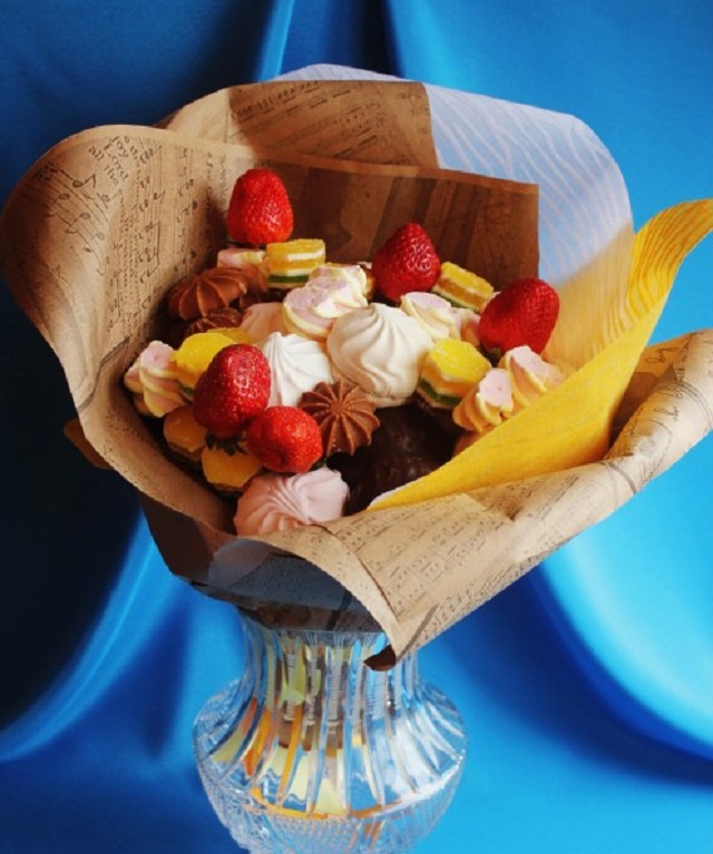 Подарочные букеты в последнее время получили довольно широкое распространение. Особенно популярны букеты с необычным содержанием, которое можно съесть. Вот несколько идей:
