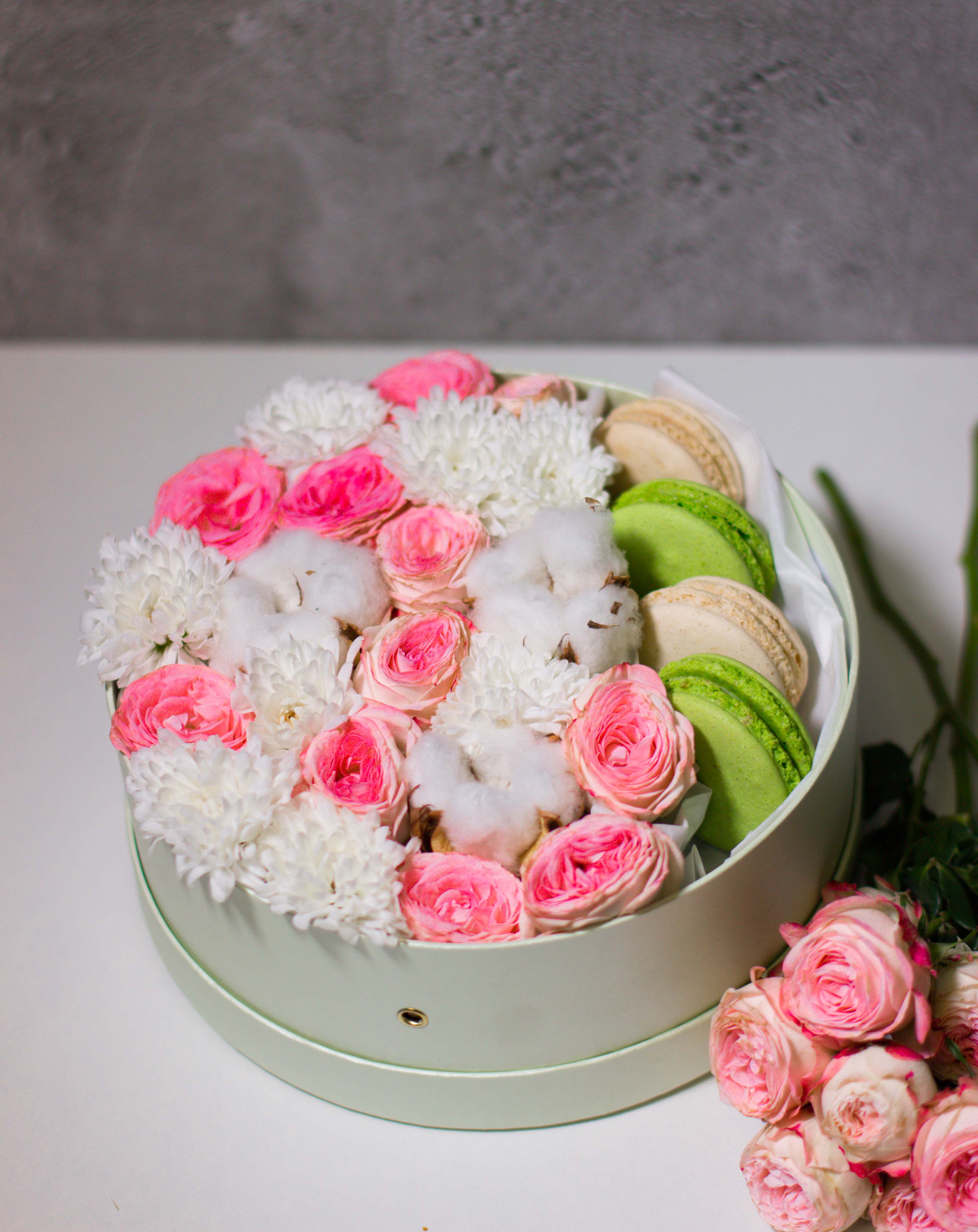 - Розы+астры+хлопковые коробочки в сочетании с популярными макаронс;