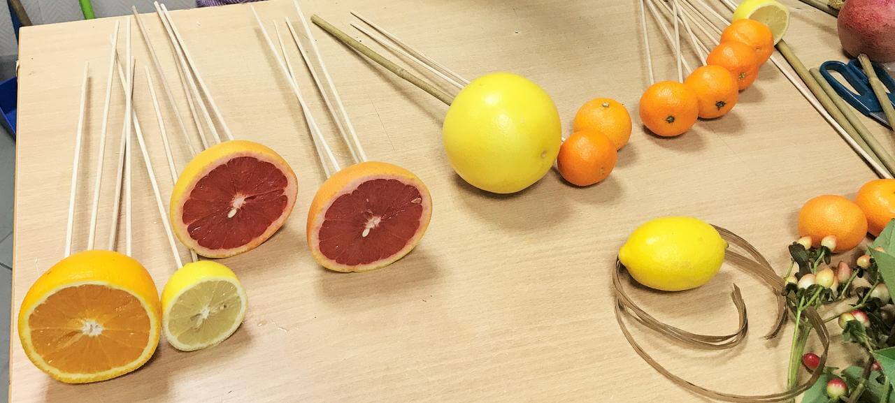 Предлагаем собрать букет следующего содержания: мандарины (7 штук), апельсины (1 штука), лимон (1 штука), грейпфрут (1 штука), лимон (2 штуки), свити (1 штука), искусственные ягоды красного цвета (4 ветки или 2 больших), гранат (2 штуки), зелень, палочки корицы, оберточная бумага, бамбуковые палочки.