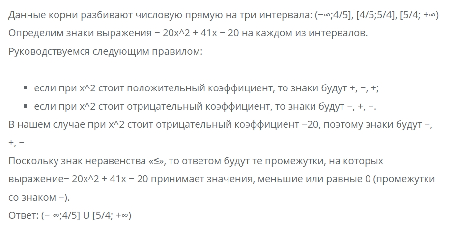 Поскольку знак неравенства «≥», то ответом будут те промежутки, на которых выражение 4x^2 − 8x − 5 принимает значения, большие или равные 0 (промежутки со знаком +).