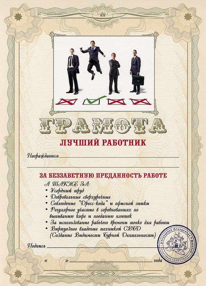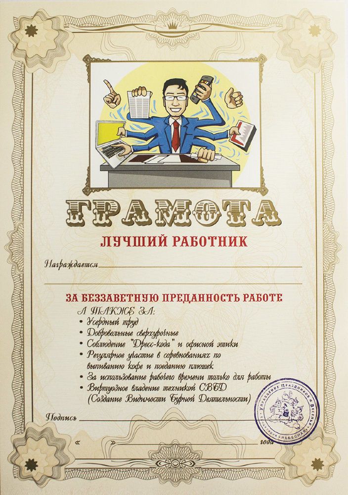 - Сотрудник, который уходит с работы позже других — «За самоотверженный офисный труд».