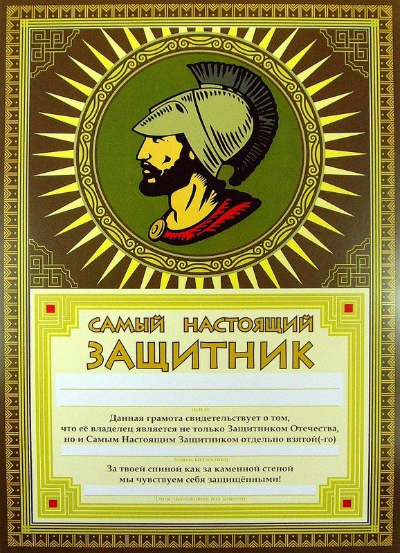 Женщины компании или предприятия к 23 февраля готовят для мужчин своего коллектива памятные подарки и поздравления. Конечно, это должен быть красиво накрытый стол, музыка и торжественная часть. Но, чтобы этот день в году запомнился надолго, предлагаем вручить сильной половине коллектива Почетные грамоты с шуточными номинациями. Они заменят банальные открытки и станут отличным поводом для хорошего настроения. А сделать их более презентабельными помогут рамки, куда их нужно поместить после распечатки.