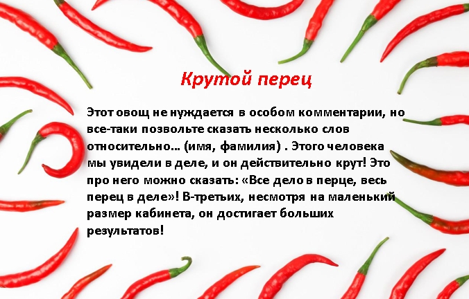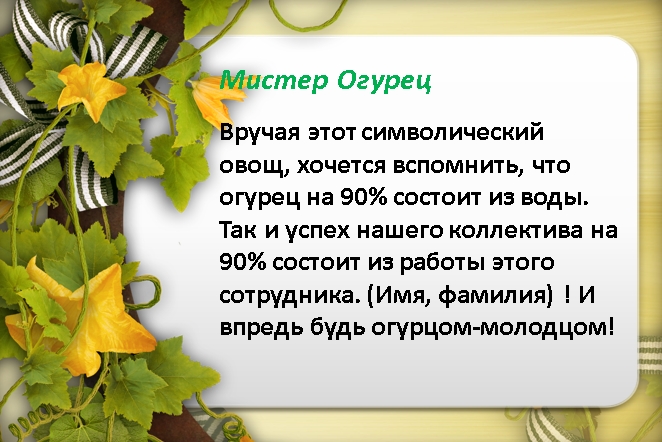 Так же, можно преподнести лучшим мужчинам-сотрудникам призы-овощи, символизирующие вклад в деятельность компании. Для этого необходимо подметить их профессиональные качества.