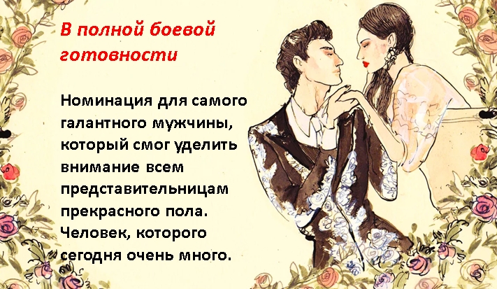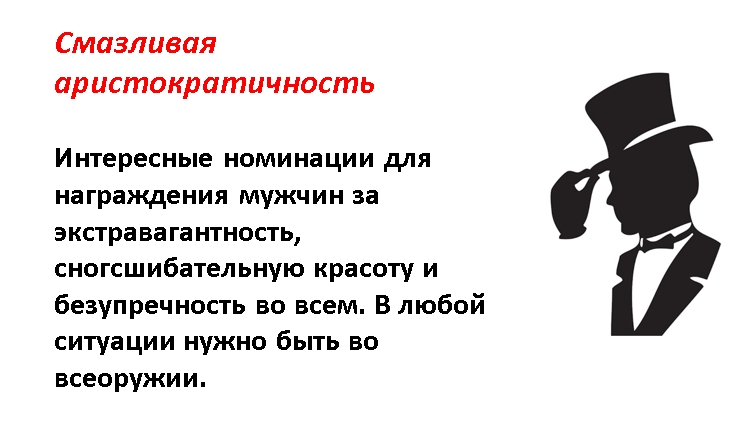 В нашей жизни всегда есть место юмору. Особенно он уместен на корпоративах, которых в году может быть несколько. Обычно они посвящены праздничному дню или Дню рождения компании. Чтобы показать важность представителей мужского пола, можно их отметить не только памятными подарками, но и шуточными номинациями. Здесь необходимо проявить фантазию, подумать над тем, чем хорош мужчина, чем он отличается от других, какой у него характер. Имеют значения профессиональные качества, привычки, темперамент, умение общаться, манера одеваться, обаяние, умение завлечь в свои сети женщин и пр.