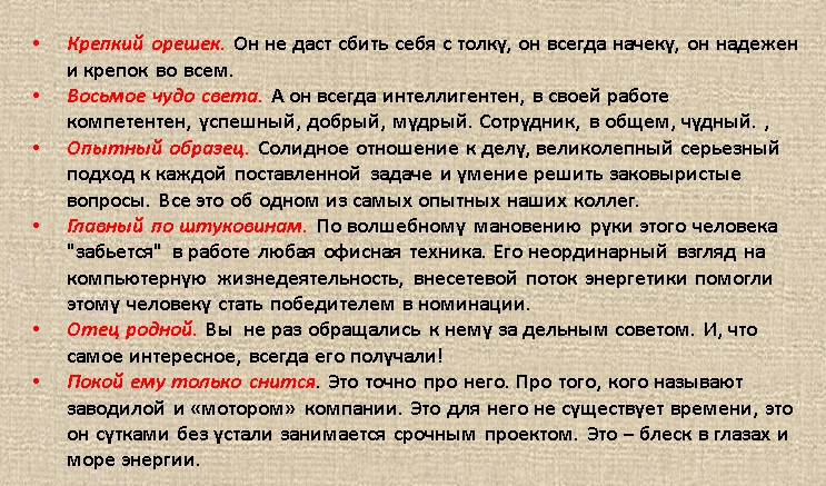 Можно придумать собственные формулировки с определенным подтекстом, но не в обидной форме. Если номинация говорит о каком-то недостатке сотрудника, она будет служить поводом поработать над собой.